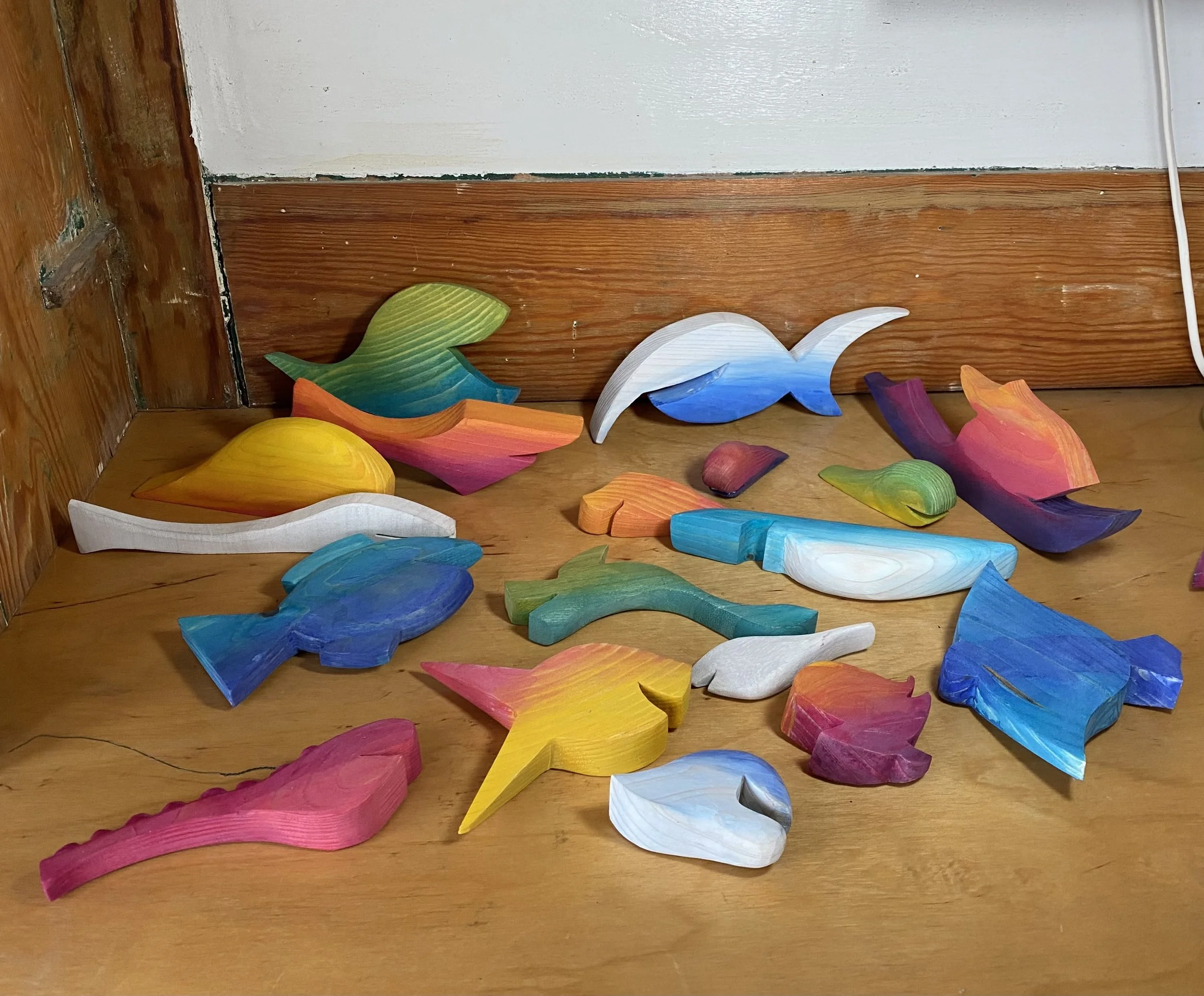 Die Fische werden aus Kiefervollholz ausgesägt, geformt und geschliffen.